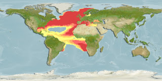Su distribución.Por todo el mundo en los mares tropicales y subtropicales, pero ausente del Mar Mediterráneo. Especies altamente migratorias, anexo I del convenio de 1982 sobre el derecho del mar.