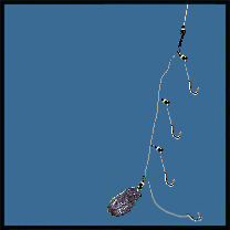 Plomos: En este método los plomos o lastres varían bastante con respecto a otras técnicas. Si pensamos que se deberá luchar contra fuertes mareas, deberán usarse plomos bastante pesados hasta de más de 1 kilogramo de peso.Las formas y tamaños dependerán de los fondos en los que pesquemos y la profundidad y marea existente.