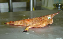 Cuerpo como un disco aplanado; hocico puntiagudo, con un cuerno romo de hueso grande proyectándose bien hacia adelante antes de los ojos; ojos en los costados de la cabeza; aberturas branquiales altas, por encima de la base de la aleta pectoral; aletas pectorales y pélvicas como extremidades; aleta dorsal, cubierta con piel en la cola, aleta anal pequeña y carnosa por debajo de la cola.